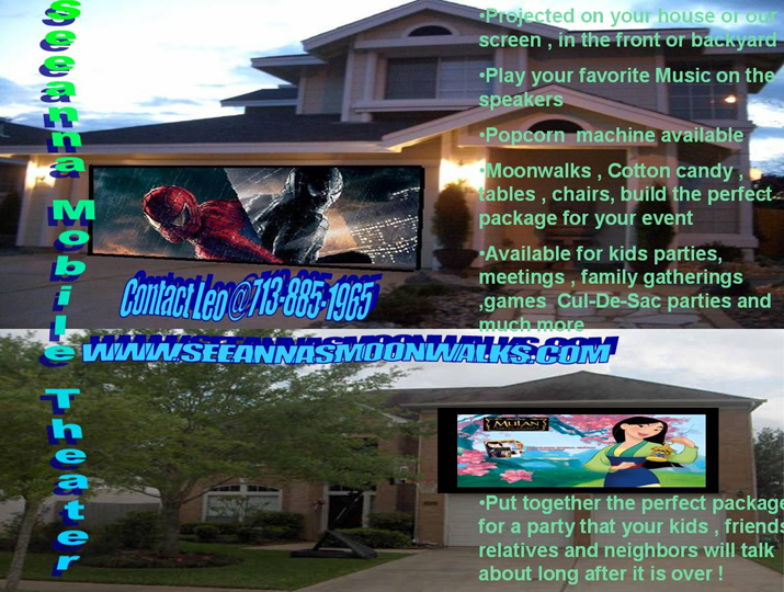 THE MOBILE THEATER INCLUDES: ALL EQUIPMENT, BLOW UP SCREEN, SPEAKERS, AND THE PROJECTOR! DONT FORGET WE HAVE POPCORN MACHINES TOO! Price: $110.00